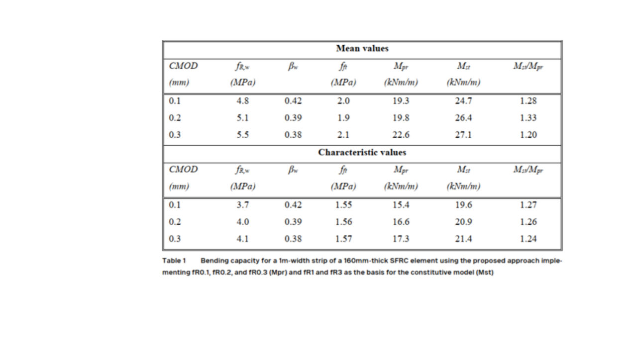 To check the SLS performance of the Steel Fiber Reinforced Concrete structure, we propose to compare the bending moment under SLS loads with the SLS bending capacity, i.e. partial safety factors equal to one. To do this easily and efficiently, designers must take into account the design tensile strength derived from the residual flexural strength (with reference to the EN14651) values associated with specific crack widths, typically 0.1, 0.2, or 0.3mm.